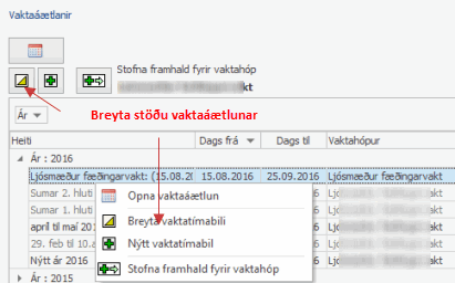 er hægt að hægrismella á áætlun og velja "Breyta vaktatímabili"