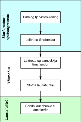 Tímafærslur (stimplanir og aðrar tímafærslur) þurfa samþykki til að niðurstaða úr útreikningi á þeim flytjist yfir í launakerfi.