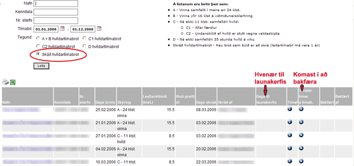 Smellt er á "S" hlekkinn til að fá upp öll hvíldartímabrot sem skráð hafa verið á starfsmanninn á völdu tímabili. Birt eru brot hálfu ári fyrir byrjunardagsetningu tímabils og hálfu ári eftir lokadagsetningun.