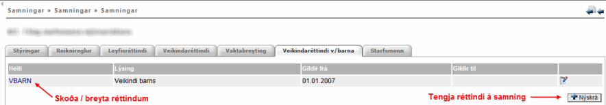 Ef smellt er á heiti réttinda er hægt að breyta réttindum og einnig sést við hvaða samninga búið er að tengja réttindin.