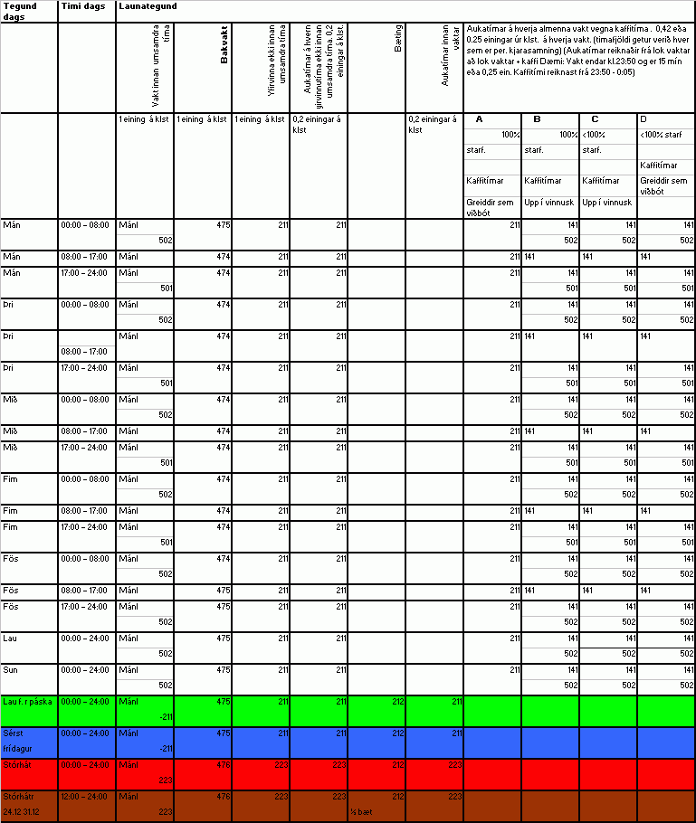 Starfsmenn fá greitt vaktaálag fyrir vinnu á sérstökum frídögum og frí í 88 klst/ári (m.v. starfsmann í fullri vinnu allt árið)