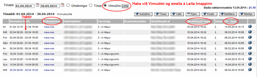 Velja þarf tímabil sem á að skoða, haka við "Vinnutími" og smella á "Leita" hnappinn. Þar er hægt að sjá vaktir sem skráðar eru á bakvið tímafærslurnar, á hvaða vaktaáætlun þær eru, dagsetningu skráningar eða breytingar og dagsetningu útreiknings.