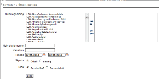 Hægt er að leita eftir skipulagseiningum sem innskráður starfsmaður hefur aðgang að, nafni starfsmanns, tímabili og hvort birta eigi samandregna skýrslu með samtölum yfir útköll og tíma eða sundurliðaða töflu sem birtir öll útköll starfsmanna.